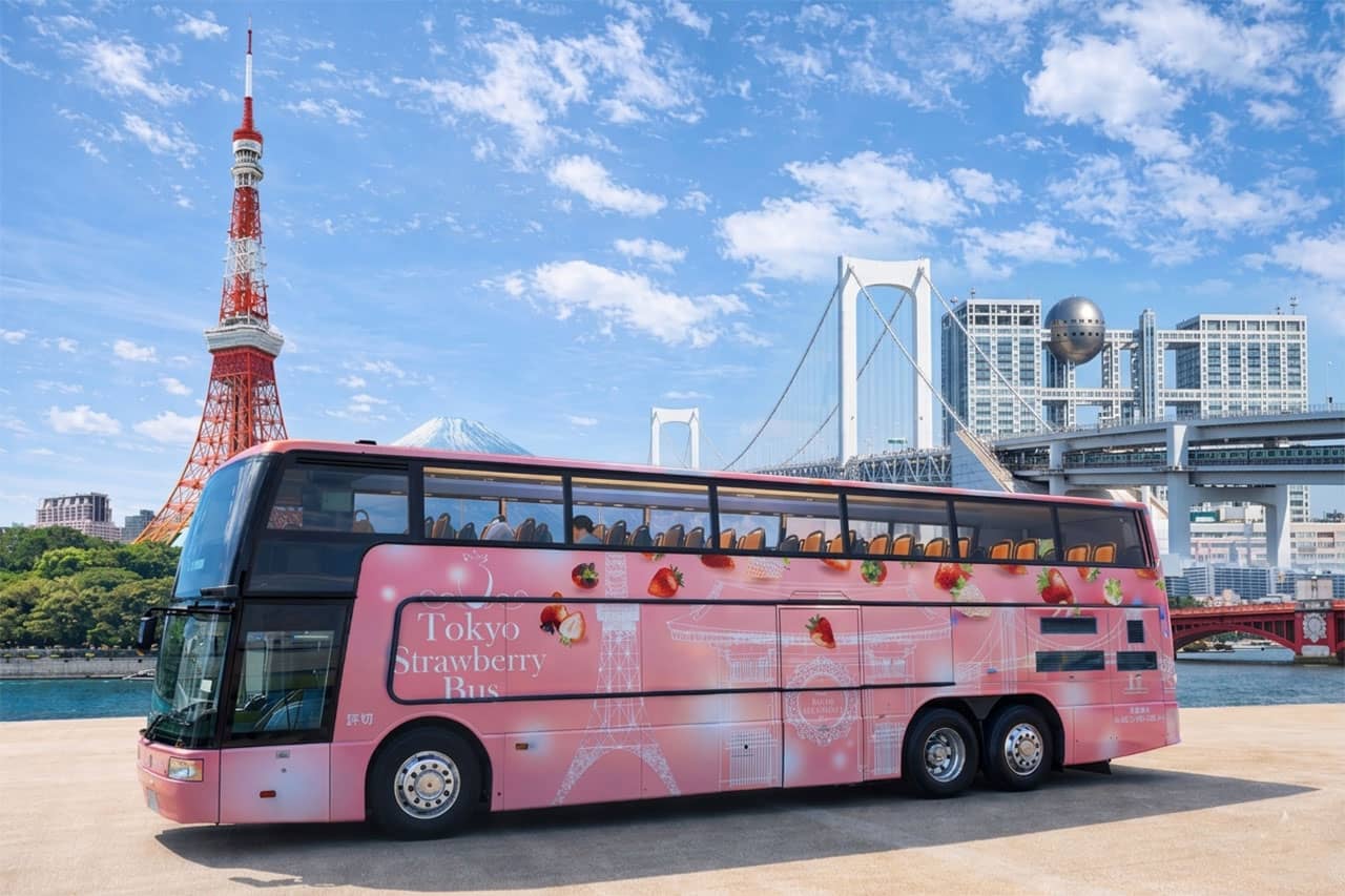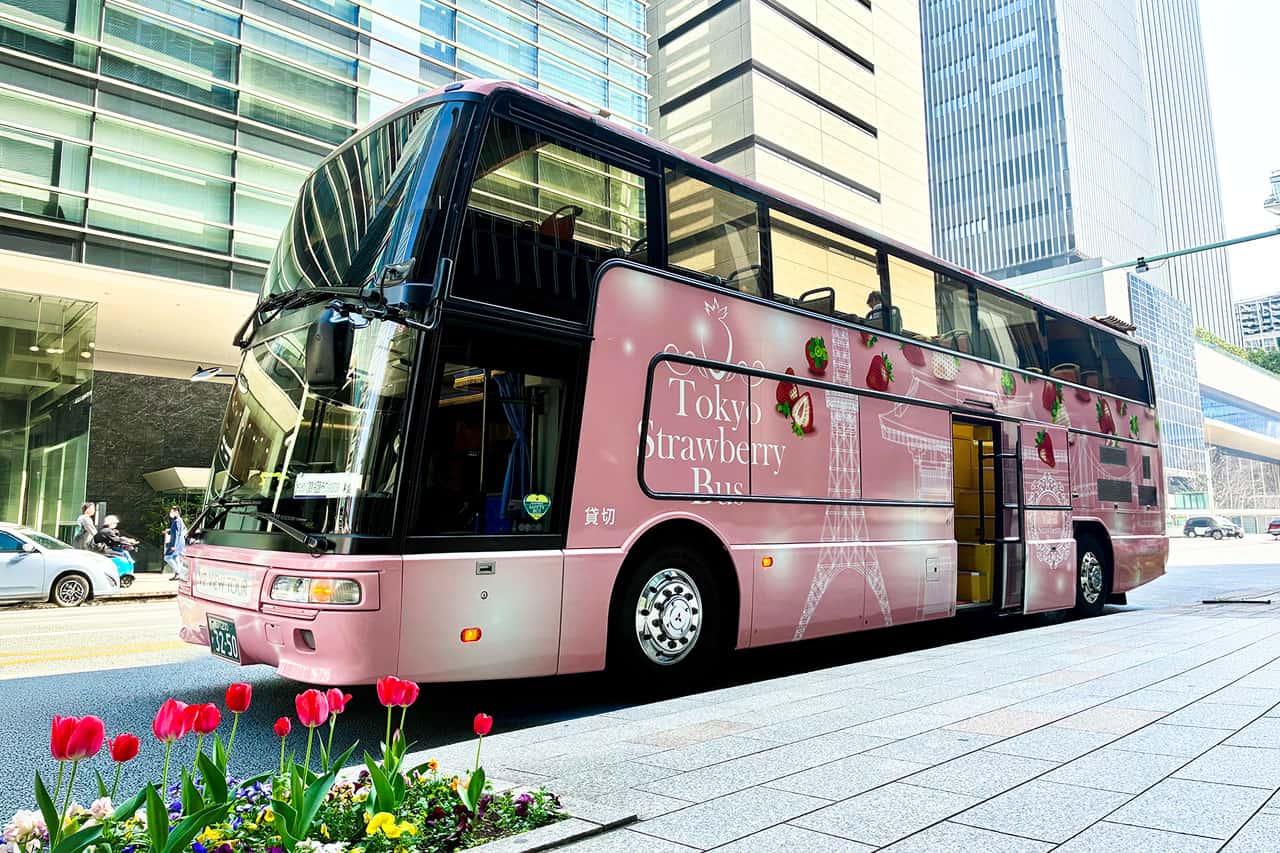 しかも二階建てのオープントップバス。いちご×都内をイメージした可愛いいちごラッピングが特長です。
