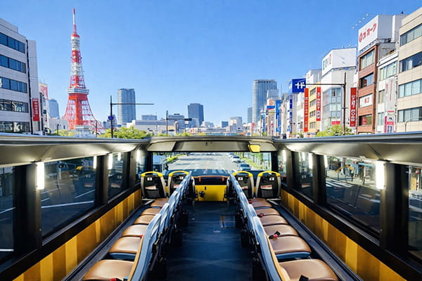 皇居、東京ミッドタウン、六本木、東京タワー、銀座・・・。屋根のない開放的なバスで、大都会・東京の高層ビル群を見上げるパノラマビューを堪能する約70分のコースです。