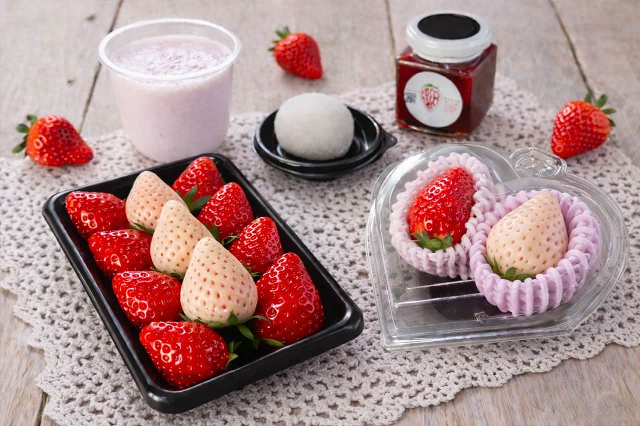 近年全国優勝連続3回を誇る美味しくて酸味と甘味のバランスが絶妙!と言われるいちご「あまりん」や「天使のいちご(通称白いちご)」のほか、一度飲んだら忘れられない!?いちごのジャムージー(スムージー)や自分で作るいちご大福、農園の特製いちごジャムなどが入っています。